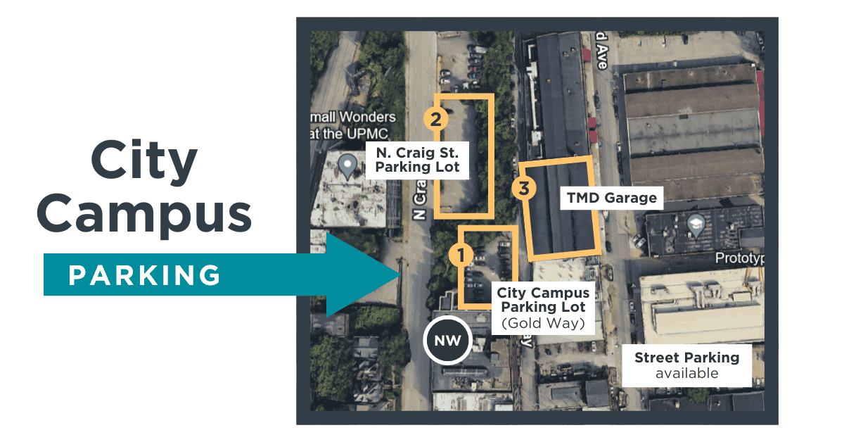 Located on 451 Gold Way, Pittsburgh, PA 15213 you will enter our city campus parking lot on a one way street. Keep an eye out for the North Way signs and parking volunteers in reflective vests to guide you where you can park. We have a lot up front for first-time visitors and families with young children as well as a covered garage.